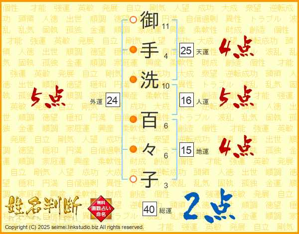生活面を象徴する運勢です。外部から受ける影響力を表し、結婚運、家庭運や職場、環境への順応性を表します。総運から人運を引いた画数。姓や名が1文字の場合を除く。