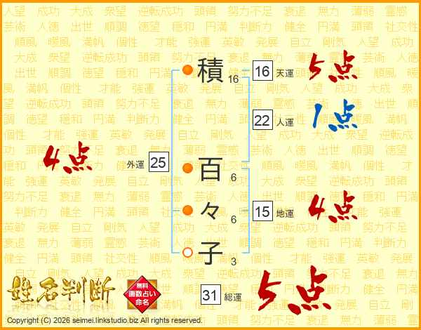 生活面を象徴する運勢です。外部から受ける影響力を表し、結婚運、家庭運や職場、環境への順応性を表します。総運から人運を引いた画数。姓や名が1文字の場合を除く。