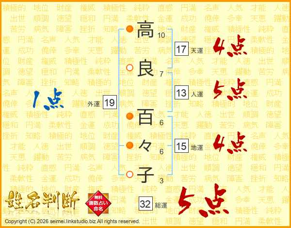 高(10画)良(7画) 百(6画)々(6画)子(3画)