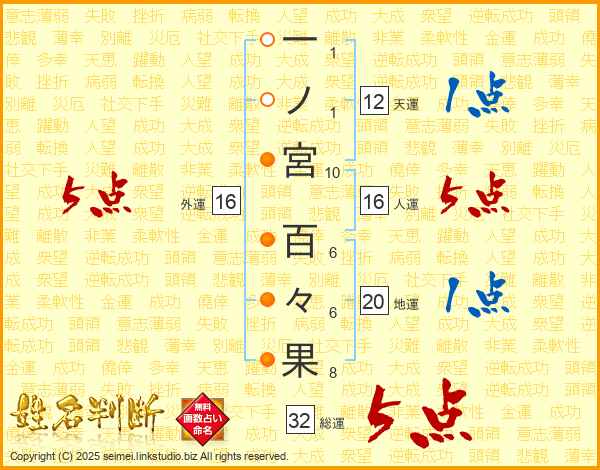 一ノ宮百々果さんの総運は32画の5点!