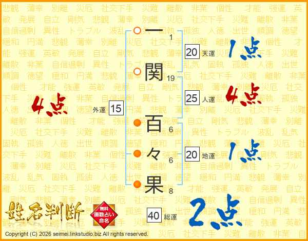 生活面を象徴する運勢です。外部から受ける影響力を表し、結婚運、家庭運や職場、環境への順応性を表します。総運から人運を引いた画数。姓や名が1文字の場合を除く。