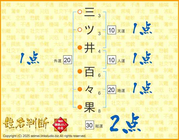 生活面を象徴する運勢です。外部から受ける影響力を表し、結婚運、家庭運や職場、環境への順応性を表します。総運から人運を引いた画数。姓や名が1文字の場合を除く。