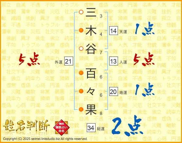 生活面を象徴する運勢です。外部から受ける影響力を表し、結婚運、家庭運や職場、環境への順応性を表します。総運から人運を引いた画数。姓や名が1文字の場合を除く。