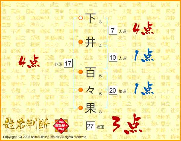 生活面を象徴する運勢です。外部から受ける影響力を表し、結婚運、家庭運や職場、環境への順応性を表します。総運から人運を引いた画数。姓や名が1文字の場合を除く。
