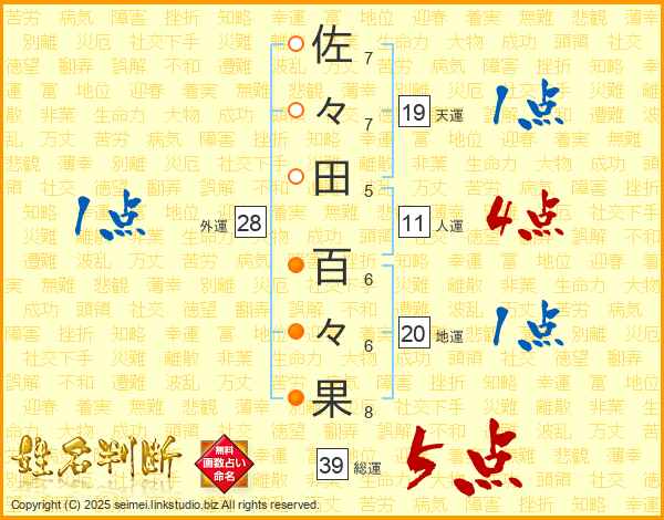 佐々田百々果さんの総運は39画の5点!