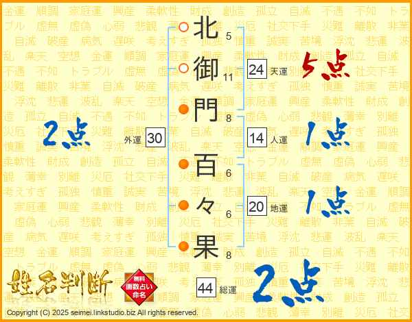 北(5画)御(11画)門(8画) 百(6画)々(6画)果(8画)