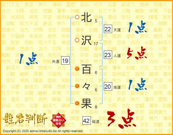 北(5画)沢(17画) 百(6画)々(6画)果(8画)