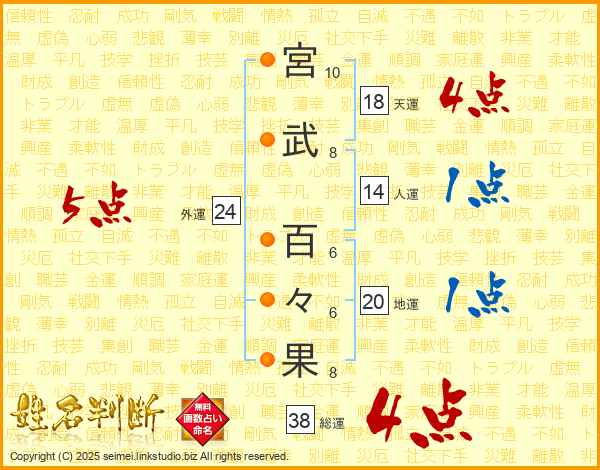 宮(10画)武(8画) 百(6画)々(6画)果(8画)