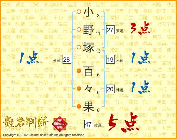小(3画)野(11画)塚(13画) 百(6画)々(6画)果(8画)