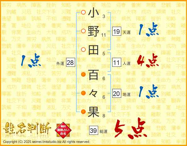 小野田百々果さんの総運は39画の5点!