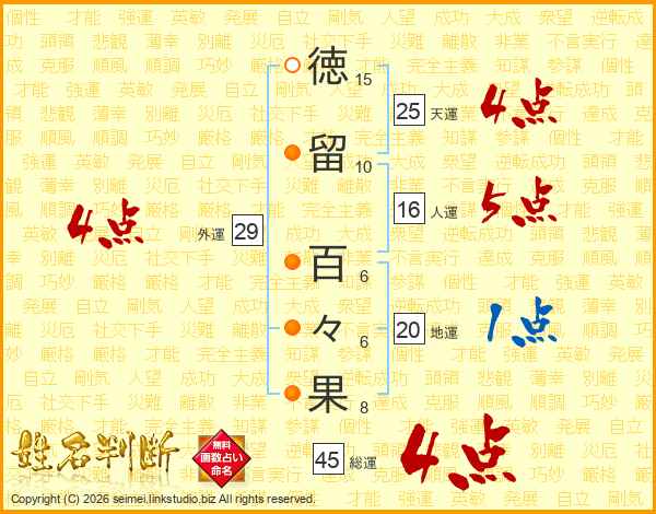 徳(15画)留(10画) 百(6画)々(6画)果(8画)