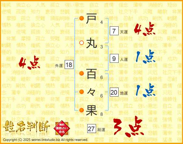 生活面を象徴する運勢です。外部から受ける影響力を表し、結婚運、家庭運や職場、環境への順応性を表します。総運から人運を引いた画数。姓や名が1文字の場合を除く。