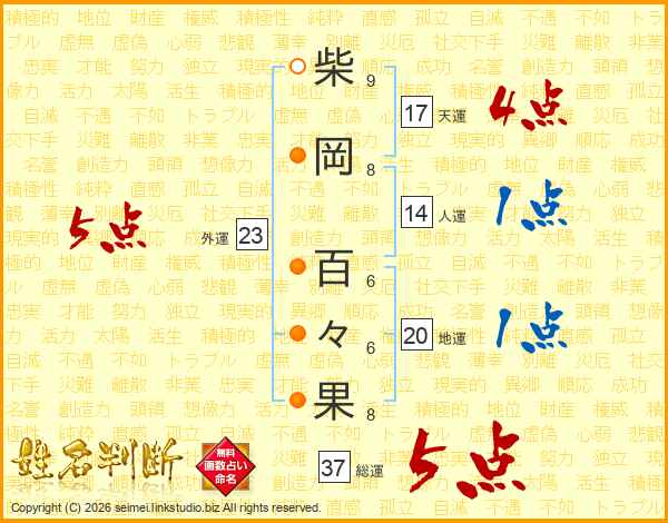 柴(9画)岡(8画) 百(6画)々(6画)果(8画)