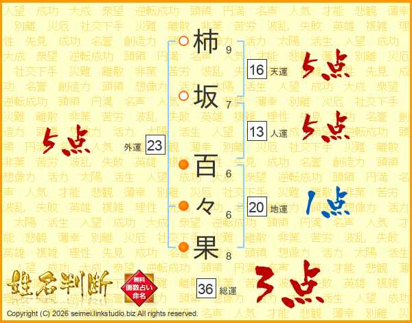 生活面を象徴する運勢です。外部から受ける影響力を表し、結婚運、家庭運や職場、環境への順応性を表します。総運から人運を引いた画数。姓や名が1文字の場合を除く。