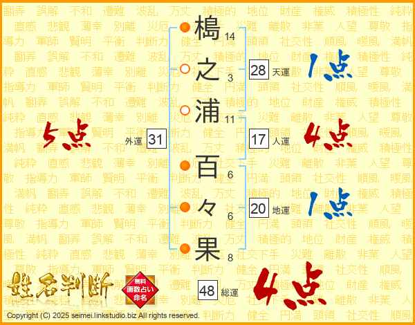 生活面を象徴する運勢です。外部から受ける影響力を表し、結婚運、家庭運や職場、環境への順応性を表します。総運から人運を引いた画数。姓や名が1文字の場合を除く。