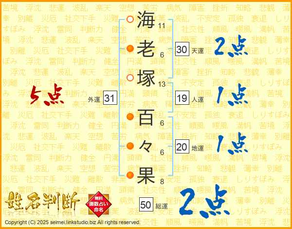 海(11画)老(6画)塚(13画) 百(6画)々(6画)果(8画)