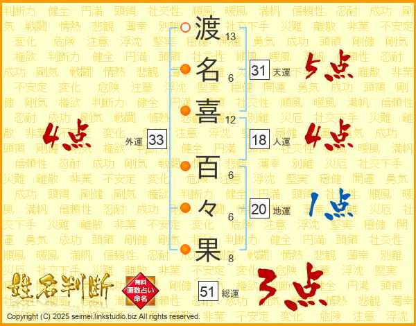 渡(13画)名(6画)喜(12画) 百(6画)々(6画)果(8画)