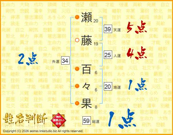 瀬(20画)藤(19画) 百(6画)々(6画)果(8画)