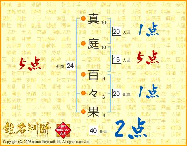 生活面を象徴する運勢です。外部から受ける影響力を表し、結婚運、家庭運や職場、環境への順応性を表します。総運から人運を引いた画数。姓や名が1文字の場合を除く。