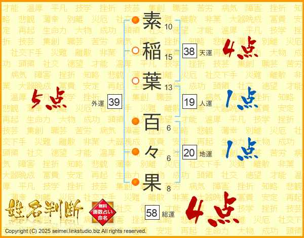 素(10画)稲(15画)葉(13画) 百(6画)々(6画)果(8画)