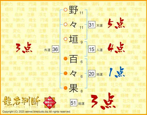 生活面を象徴する運勢です。外部から受ける影響力を表し、結婚運、家庭運や職場、環境への順応性を表します。総運から人運を引いた画数。姓や名が1文字の場合を除く。