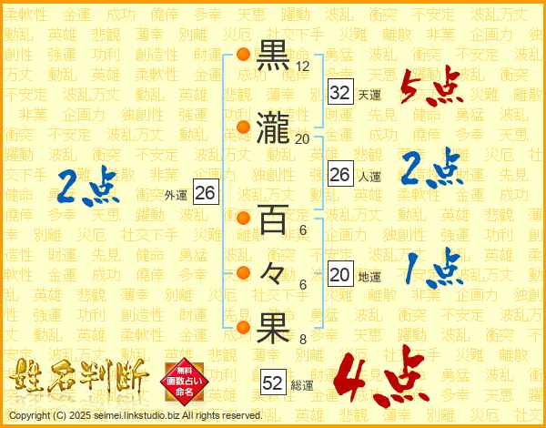 黒(12画)瀧(20画) 百(6画)々(6画)果(8画)