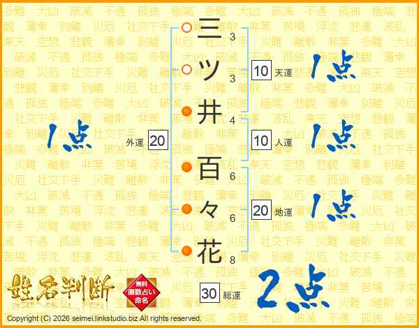 生活面を象徴する運勢です。外部から受ける影響力を表し、結婚運、家庭運や職場、環境への順応性を表します。総運から人運を引いた画数。姓や名が1文字の場合を除く。
