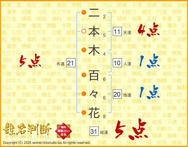 あなたの人生を表す1番重要な運勢です。生涯を通じて影響する総合運となり、主に50歳以降の晩年期に影響を及ぼします。苗字と名前の合計画数。