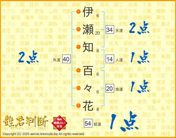 伊(6画)瀬(20画)知(8画) 百(6画)々(6画)花(8画)
