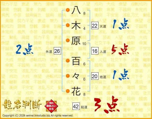 八(8画)木(4画)原(10画) 百(6画)々(6画)花(8画)