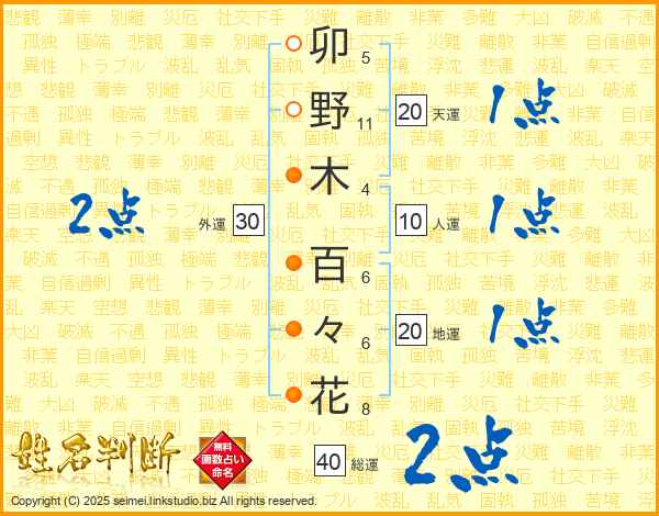 卯(5画)野(11画)木(4画) 百(6画)々(6画)花(8画)