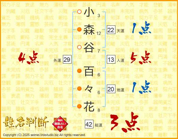 小(3画)森(12画)谷(7画) 百(6画)々(6画)花(8画)