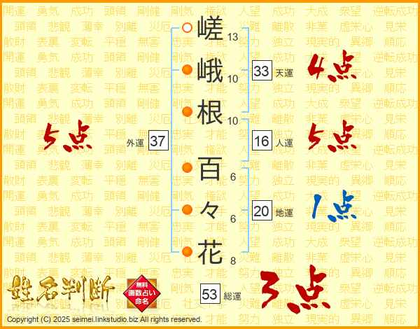 嵯峨根百々花さんの総運は53画の3点!