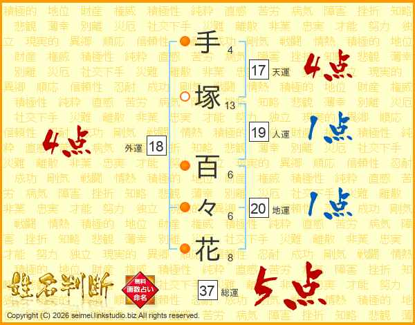 手塚百々花さんの総運は37画の5点!