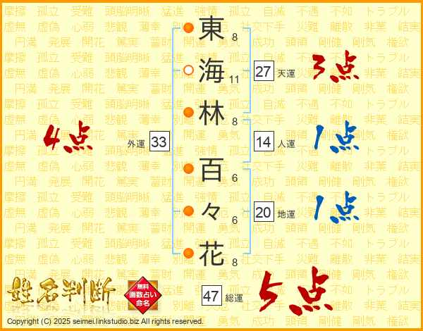 東(8画)海(11画)林(8画) 百(6画)々(6画)花(8画)