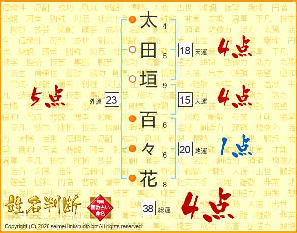 太(4画)田(5画)垣(9画) 百(6画)々(6画)花(8画)