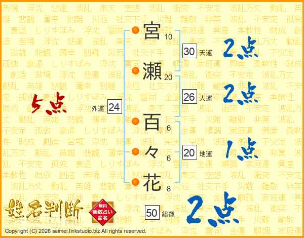 宮(10画)瀬(20画) 百(6画)々(6画)花(8画)