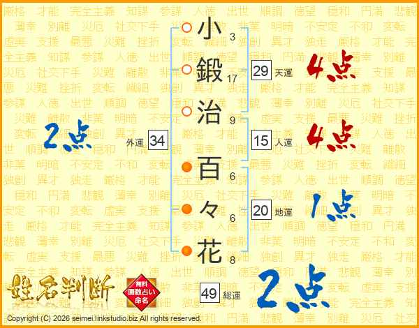 小(3画)鍛(17画)治(9画) 百(6画)々(6画)花(8画)