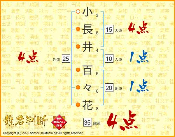 小(3画)長(8画)井(4画)  百(6画)々(6画)花(8画)