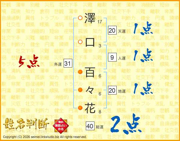 澤(17画)口(3画) 百(6画)々(6画)花(8画)