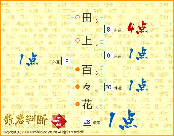 田(5画)上(3画) 百(6画)々(6画)花(8画)