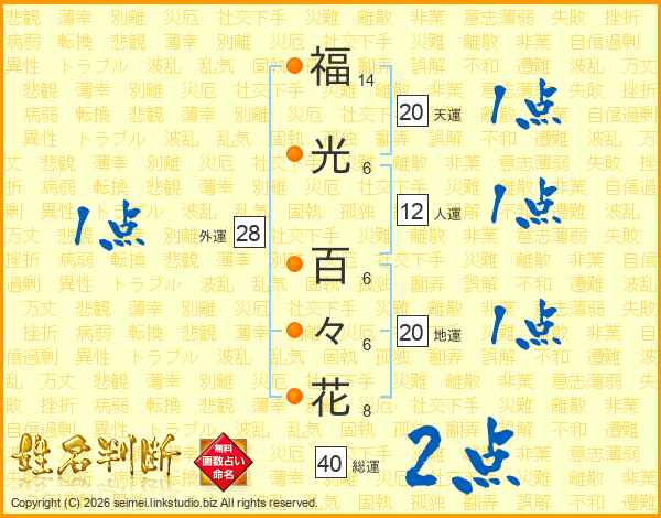 福(14画)光(6画) 百(6画)々(6画)花(8画)