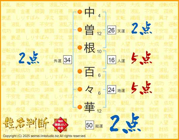 中(4画)曽(12画)根(10画) 百(6画)々(6画)華(12画)