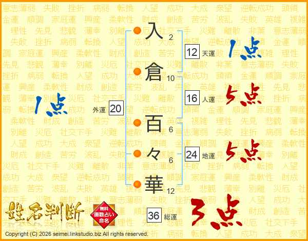 生活面を象徴する運勢です。外部から受ける影響力を表し、結婚運、家庭運や職場、環境への順応性を表します。総運から人運を引いた画数。姓や名が1文字の場合を除く。