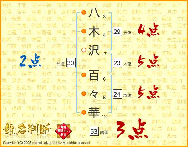 八(8画)木(4画)沢(17画) 百(6画)々(6画)華(12画)