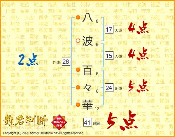 生活面を象徴する運勢です。外部から受ける影響力を表し、結婚運、家庭運や職場、環境への順応性を表します。総運から人運を引いた画数。姓や名が1文字の場合を除く。