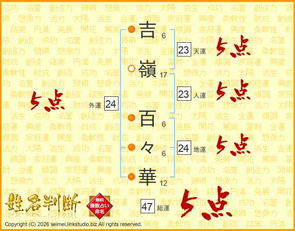 吉(6画)嶺(17画) 百(6画)々(6画)華(12画)