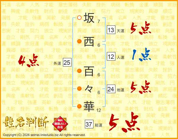 坂(7画)西(6画) 百(6画)々(6画)華(12画)