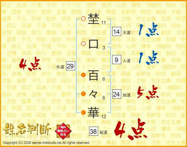 生活面を象徴する運勢です。外部から受ける影響力を表し、結婚運、家庭運や職場、環境への順応性を表します。総運から人運を引いた画数。姓や名が1文字の場合を除く。