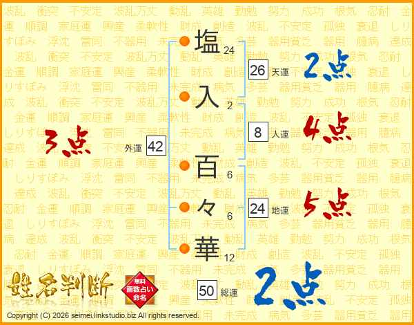 塩(24画)入(2画) 百(6画)々(6画)華(12画)